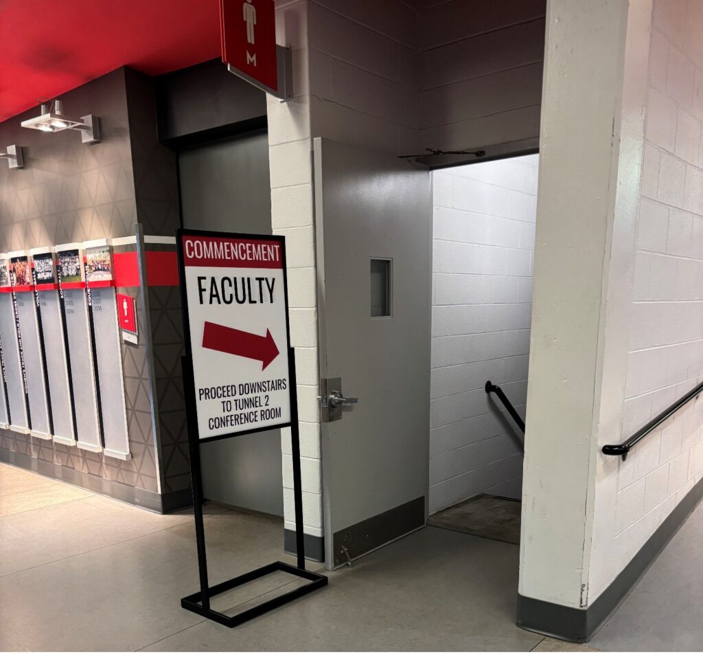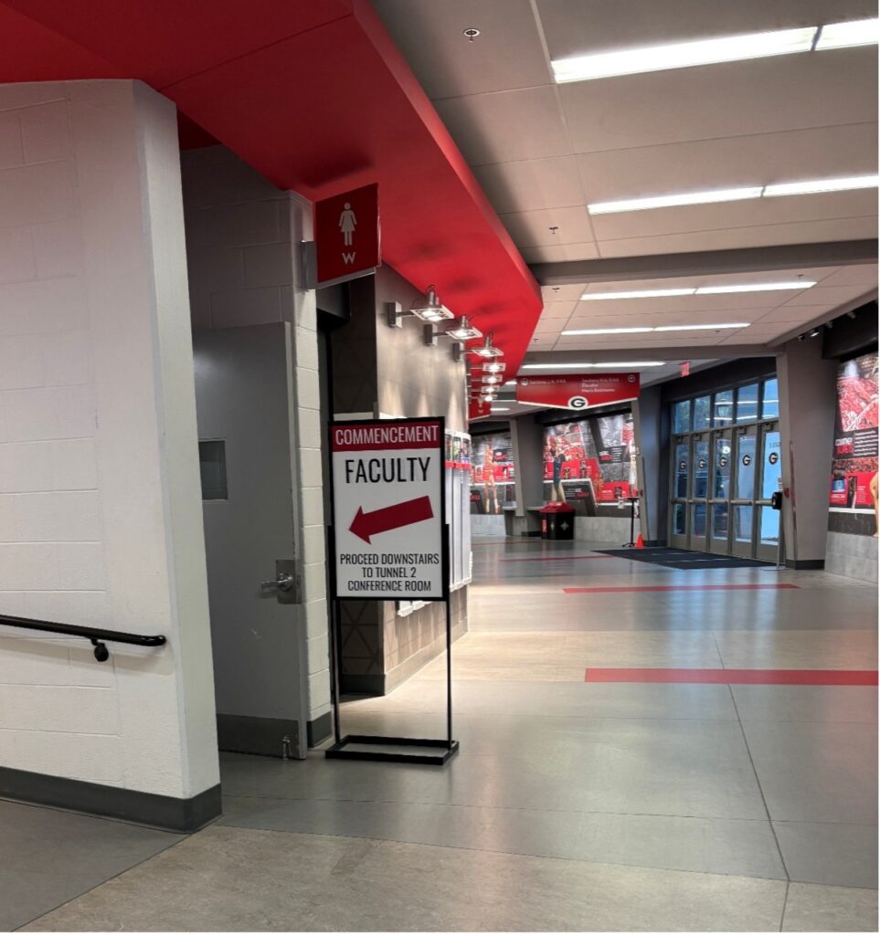 Non-hooding faculty who are processing should enter through Gate D or Gate E as these are closest to the stairs leading down to the Tunnel 2 Conference Room. Please look for the sign directing faculty down the stairs.